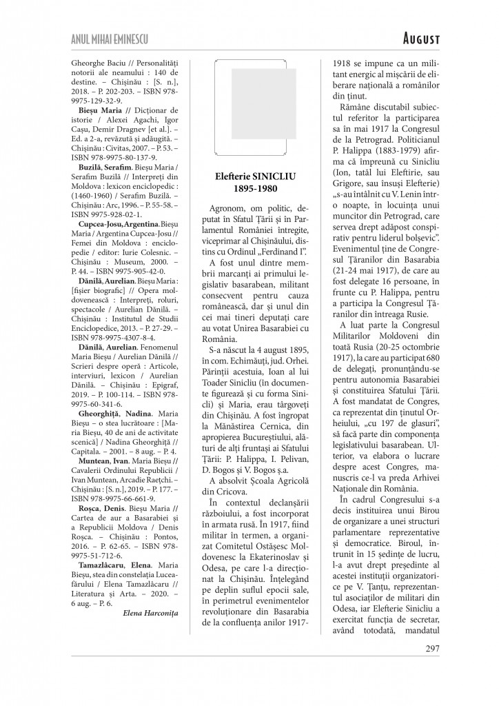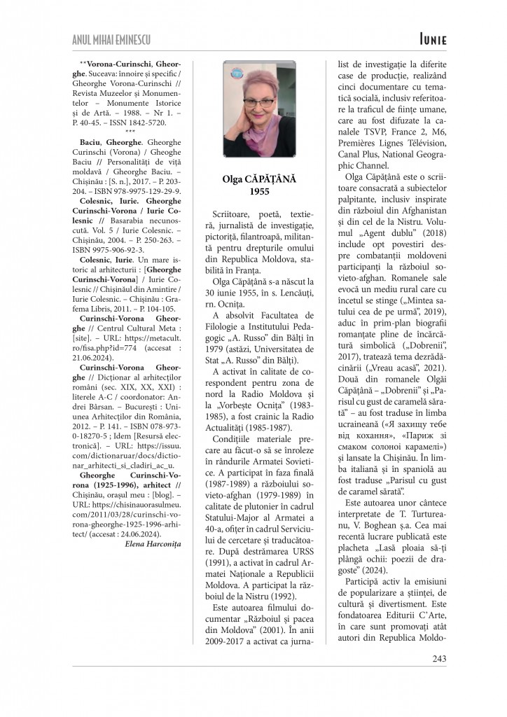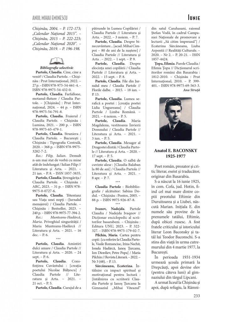 Aniversări culturale / Ministerul Culturii al Republicii Moldova, Biblioteca Naţională pentru Copii „Ion Creangă” ; responsabil de ediţie: Eugenia Bejan ; alcătuitori: Maria Harea [et al.]. – [Chişinău] : Arc, 2025 – . – ISBN 978-9975-4234-8-9.